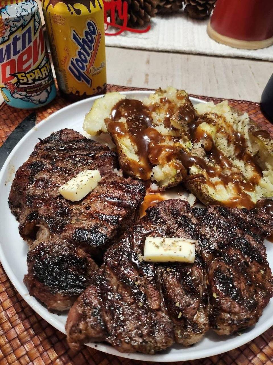 10. Assemble and Serve: Place a rested ribeye steak and a baked potato on each plate. Drizzle a generous amount of warm beef gravy over the fluffed baked potato. You can also spoon some gravy over the steak if desired. Garnish with fresh parsley or chives if using. Serve immediately with your choice of beverages, such as a refreshing Mountain Dew Spark or a classic Yoohoo Chocolate Drink. Enjoy your incredibly satisfying ribeye lunch!